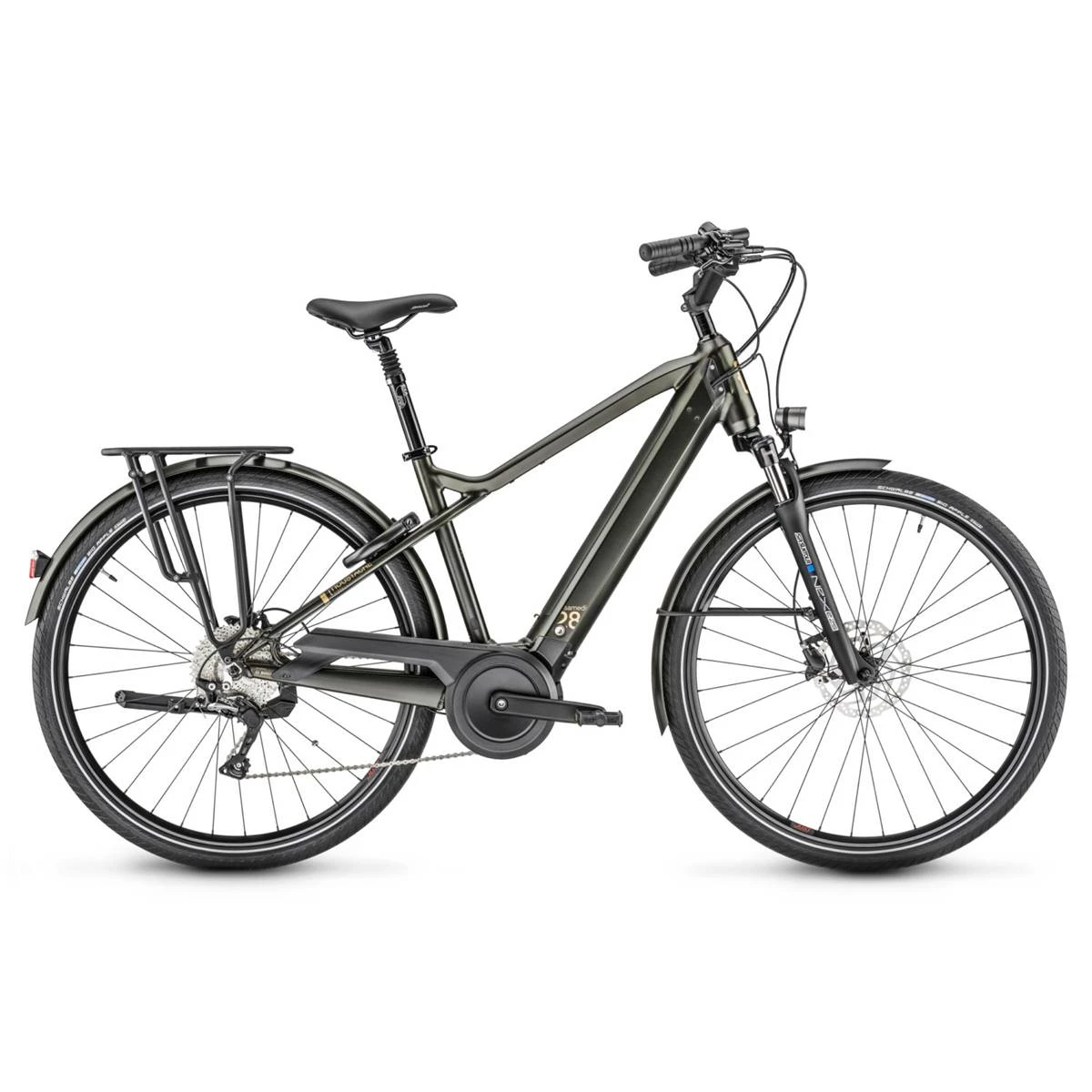 Le Samedi 28.7 bénéficie d’un cadre à la fois confortable et dynamique, avec intégration de la batterie Bosch PowerTube 625Wh, du moteur Bosch Performance Line souple et puissant, du nouveau compteur Bosch Nyon doté d’un écran tactile et compatible bluetooth, d’une fourche de 63mm de débattement ainsi qu’une tige de selle suspendue offrant 40mm pour un confort total, du fameux cintre relevé Moustache pour une posture idéale, mais également d’une transmission haut de gamme et de freins puissants. Viennent ensuite s’ajouter les accessoires tels qu’un porte-bagages compatible QL3 et MIK, un antivol intégré AXA Block et un éclairage puissant : avec de tels apparats notre Samedi 28.7 est le Prince de la ville !